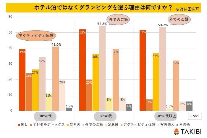 グランピングに行ったことがある・興味がある10代~60代の男女を対象とした「ホテル泊ではなくグランピングを選ぶ理由は何ですか?」というアンケートを行ったところ、1番多かった回答が「癒し」と「外でのご飯」で49%となりました。次いで「アクティビティ体験」が38%、「焚き火」が34%、「デジタルデトックス」が17%という結果になっております。