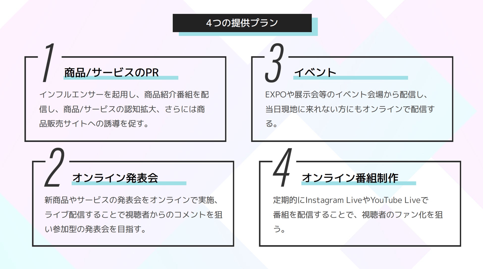 SNSやYouTubeを中心とした広告代理事業とインフルエンサー(芸能人を含む)のマネジメントを行う株式会社For you(本社:東京都渋谷区、代表取締役:野田爽介、以下「For you」)は、企画~制作、その後のプロモーションまでをまるっとサポートする「LIVE配信パッケージプラン」を本日より提供開始いたします。さらにキャスティング等のご相談にも対応可能となっております。