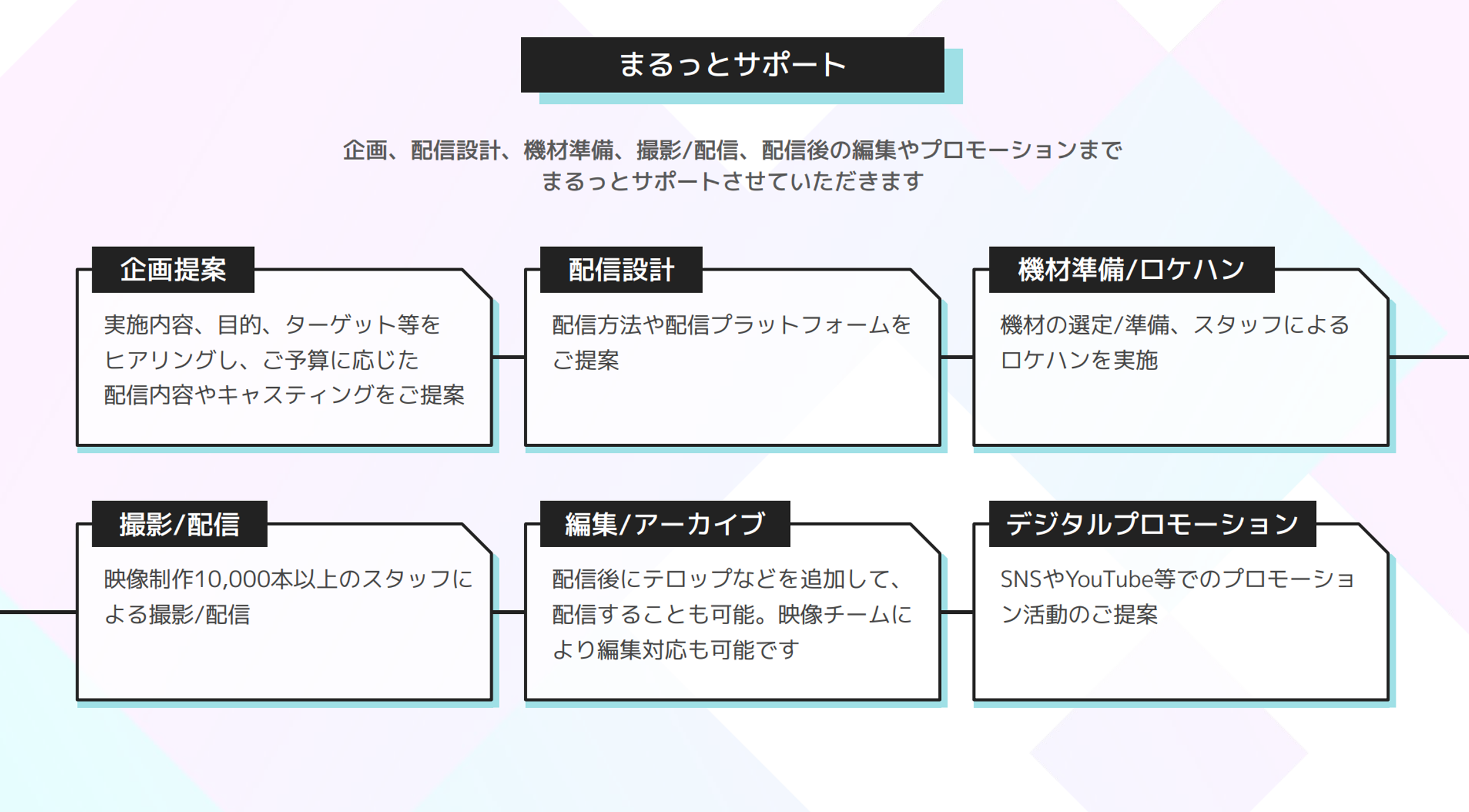 しかし、実際にライブ配信を始めようとしても、どのような企画がユーザーにささるのかという企画設計の部分や、機材の準備やロケハンなどの撮影環境を整えることが必要となります。さらに配信後の編集やプロモーションまで実施するとなると、いままでライブ配信を実施したことのない場合は、想像以上に多くの工数がかかってしまい、企業への負担となることが懸念されています。