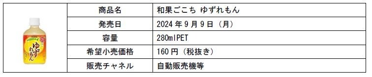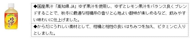 「和果ごこち ゆずれもん」は、国産「高知県JA」ゆず果汁を使用し、ゆずと相性の良いレモン果汁をバランス良くブレンドすることで、柑橘系の香りと心地よい爽やかな酸味を後味まですっきりと楽しんでいただけます。また、からだにうれしい素材として、柑橘と相性の良いはちみつを加え、ビタミンC入りの果汁系飲料に仕上げました。