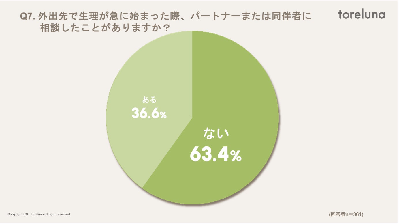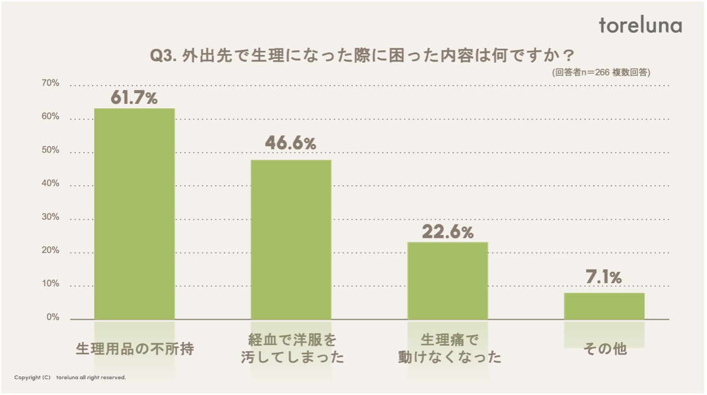 続いて「急に生理が始まった場面」で、「買い物・移動中」「旅⾏中」を合わせた「お出かけ中」が55.4%という結果に対し、横澤さんは『確かに買い物や移動中とか…本当にそうですね。家には(生理用品)があって、対処法もいくらでもあるけど、出先でなりがちですよね。それが一番つらいです!とくに学生時代は学校でなってしまうこともありますよね。』とコメント。シオリーヌさんも『横澤さんの言う通り、家にはすごくいっぱいあるのに、やっぱり生理になってしまうのは出先で…買わなきゃいけないというちょっとした悔しさがありますよね。』と大きくうなずきながら共感していました。