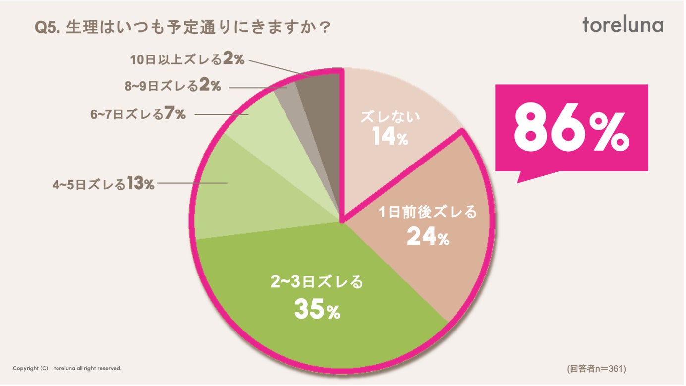 さらに「生理予定日のズレ」についてのアンケートでは86%の人がずれると回答。助産師でもあるシオリーヌさんは『年齢が原因になることがあります。思春期や閉経が近い年齢になるとホルモンバランスの変化で周期がズレやすいです。あと生活習慣の乱れやストレスなどの体調の変化が原因となる場合もあります。あとは妊娠・出産を終えたあと、産後1ヶ月くらいは出血が続きます。それが収まると授乳している間は生理が来づらくはなるんですけど、人によってはバラつきがあって、生理が再開する人もいます。」とコメント。