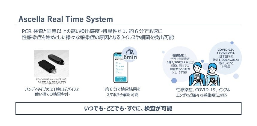 Ascella社の有する技術「Ascella Real Time System」は、PCR検査と同等以上の高い検出感度・特異性かつ、約6分で迅速に様々な感染症の原因となるウイルスや細菌を検出可能です。ハンディタイプのIoT検出デバイスと使い捨ての検査キットによる「いつでも、どこでも、すぐに」検査を行えるポイント・オブ・ケア・テストとして、様々な利用状況での需要を見込んでおります。Ascella社の技術は、国立研究開発法人理化学研究所への委託研究において、十分な蓋然性が証明されており、コロナウィルス、インフルエンザだけでなく、性感染症検査への応用の可能性が示されております。
