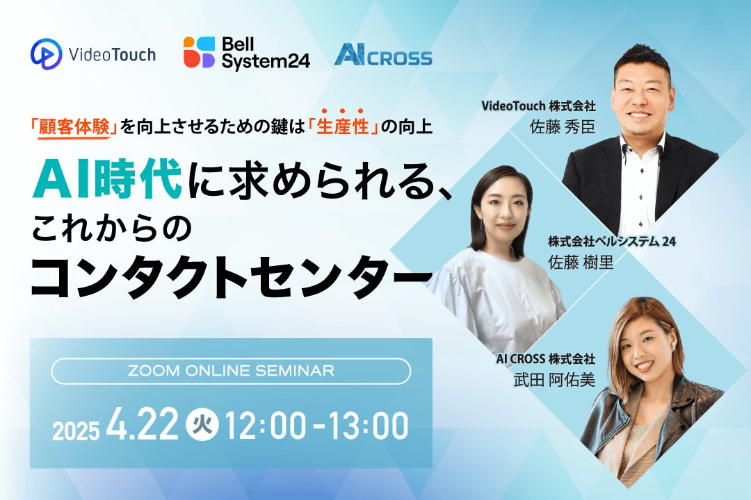 AI CROSS株式会社(本社︓東京都港区、代表取締役CEO︓原⽥ 典⼦、以下「AI CROSS」)は、株式会社ベルシステム24(本社︓東京都港区、代表取締役 社⻑執⾏役 員︓梶原 浩)、VideoTouch株式会社(本社︓東京都渋⾕区、代表取締役︓上坂 優 太)とともに、2025年4⽉22⽇(⽕)12時より無料オンラインセミナーを開催します。