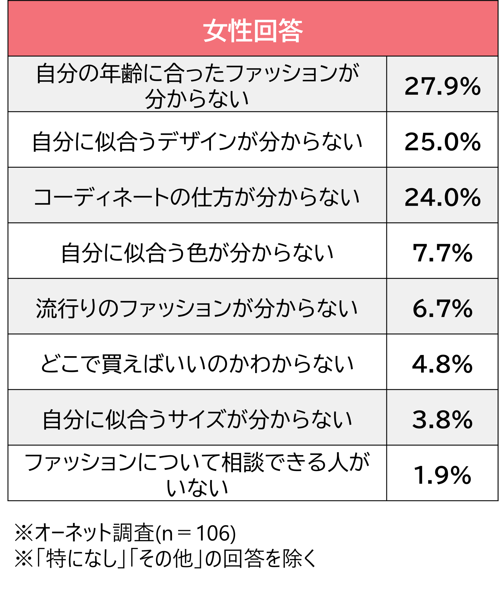 ✓「自分に似合うデザインが分からない」「コーディネートの仕方が分からない」「自分の年齢に合ったファッションが分からない」がトップ3にランクインしており、男女共に同じ悩みを持っていることがわかった。