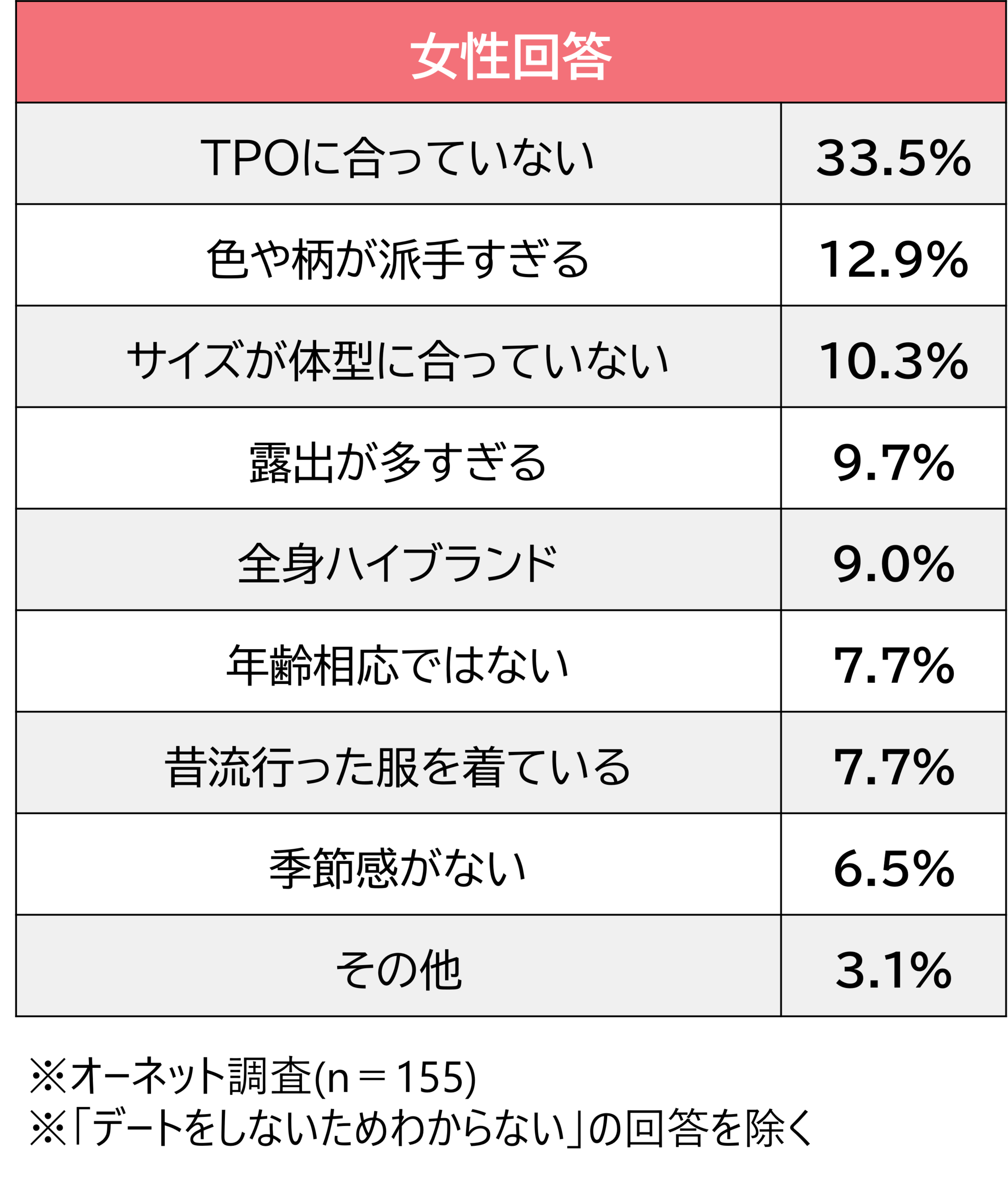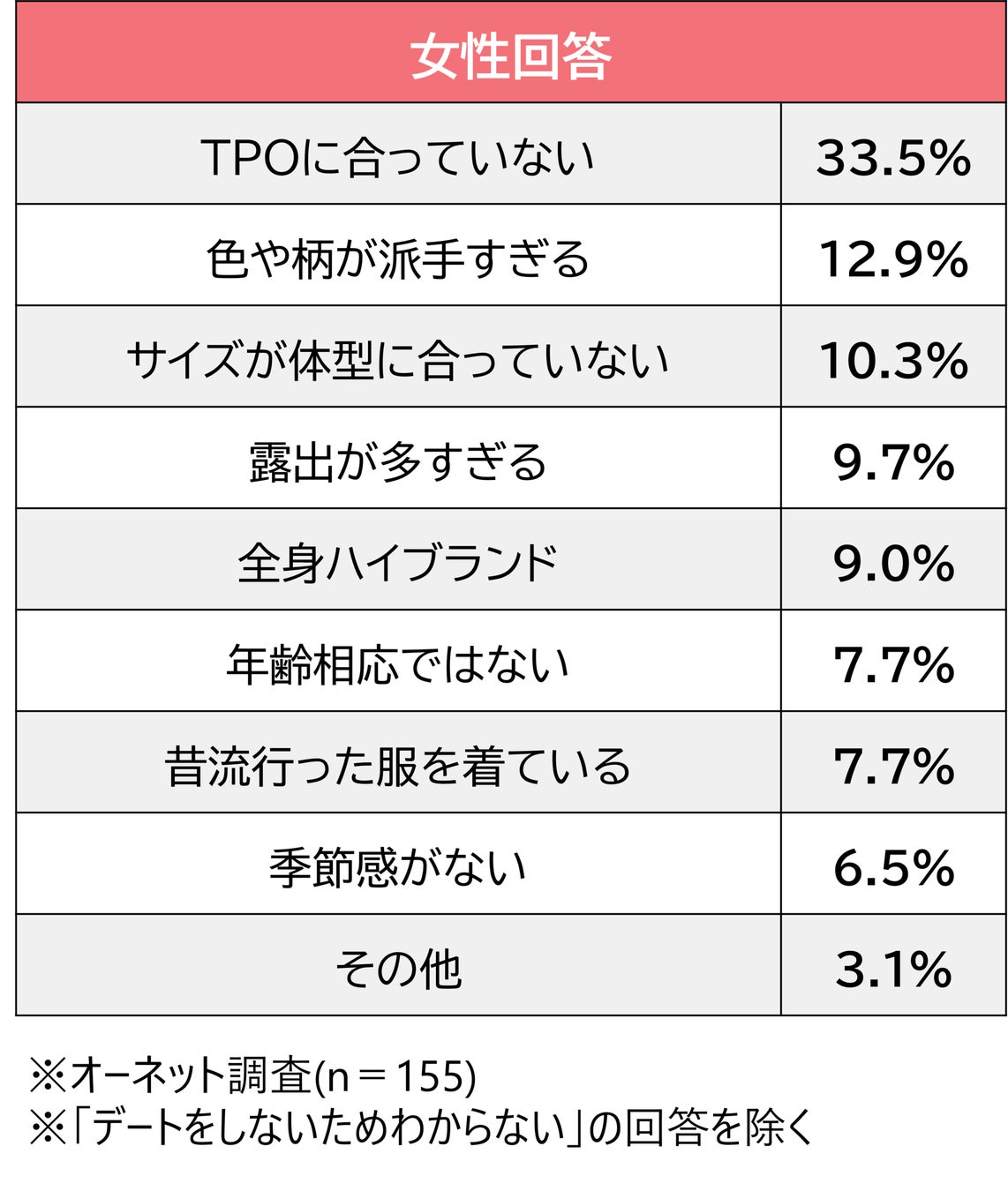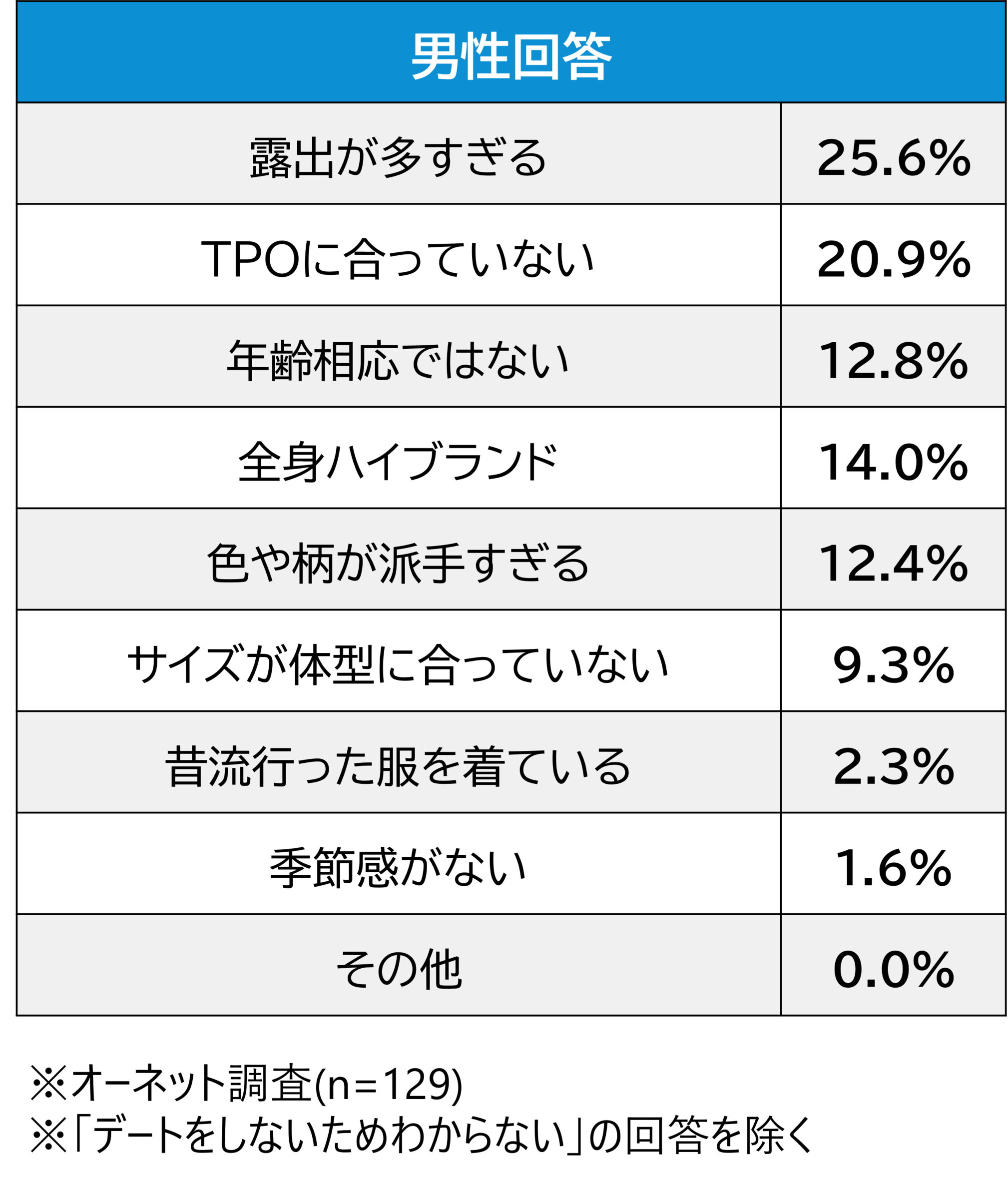 ✓男性回答トップは「露出が多すぎる」、女性回答トップは「TPOに合っていない」となった。
