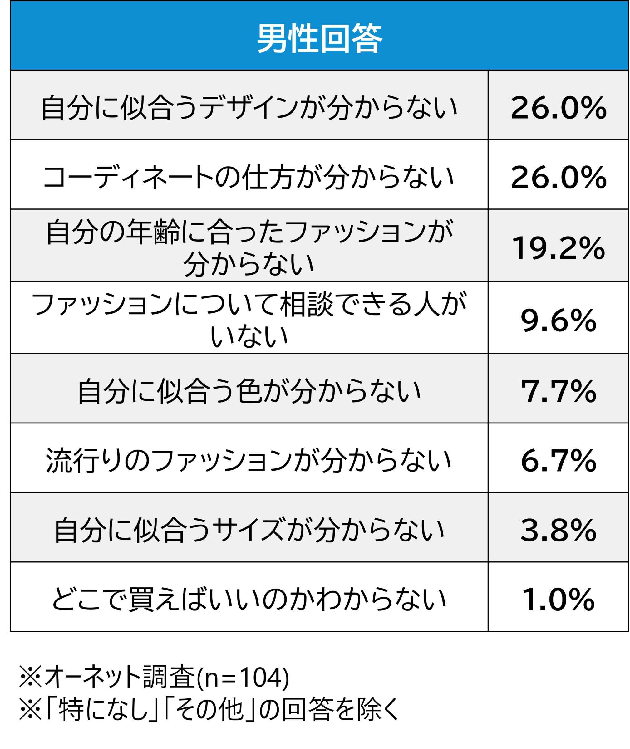 また、女性のランキングでは最下位の「ファッションについて相談できる人がいない」が男性では4位と上位にランクインしている。女性は友人同士でファッションの話をするが、男性は少ないためか相談できる相手が欲しいのだと考えられる。