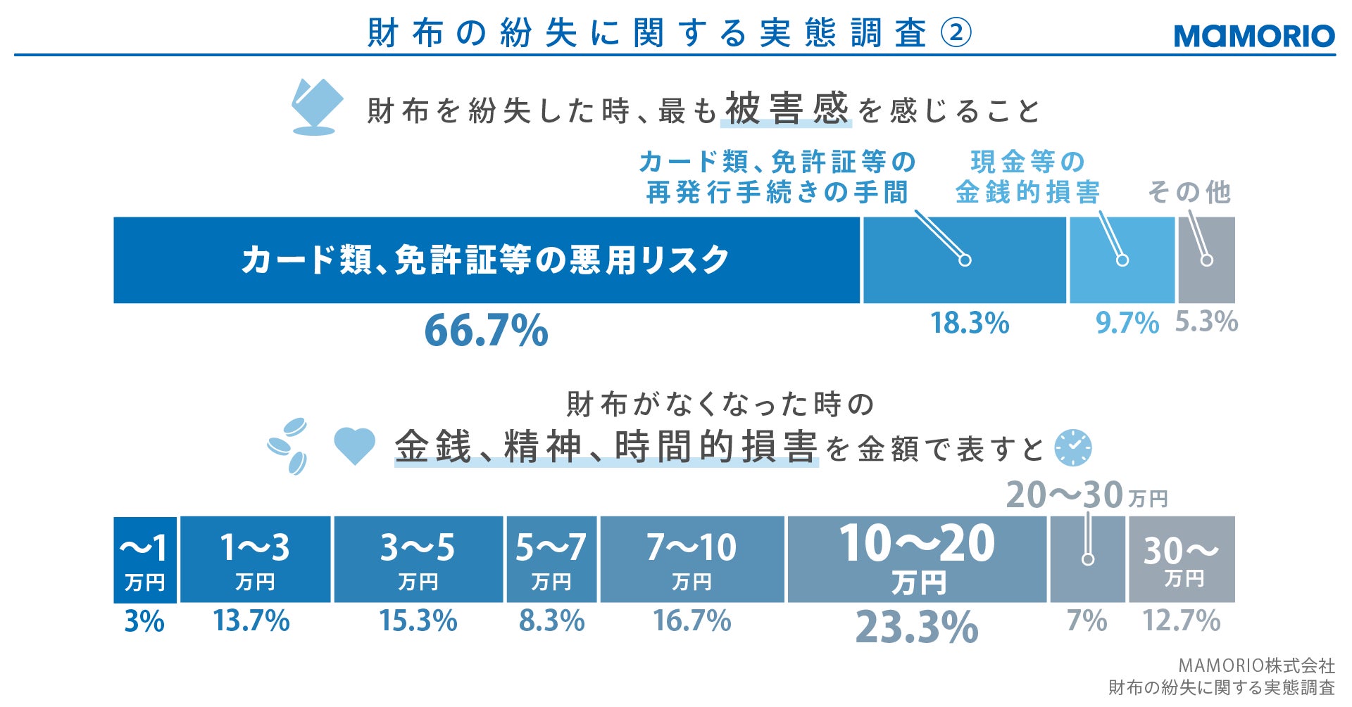 財布の紛失について最も被害を感じることについては「カード類、免許書等への悪用リスク」が66.7%で最多、財布がなくなったときの金銭・精神・時間的損害を金額で表すと、「10万円〜20万円」が23.3%で最多となりました。多くの人々が財布や現金といった経済的な損害以上に、これら「カード類、免許書等への悪用リスク」を高く感じていることがわかります。また現在、財布に現在紛失防止タグを用いて紛失対策を行っている方は5.3%でした。