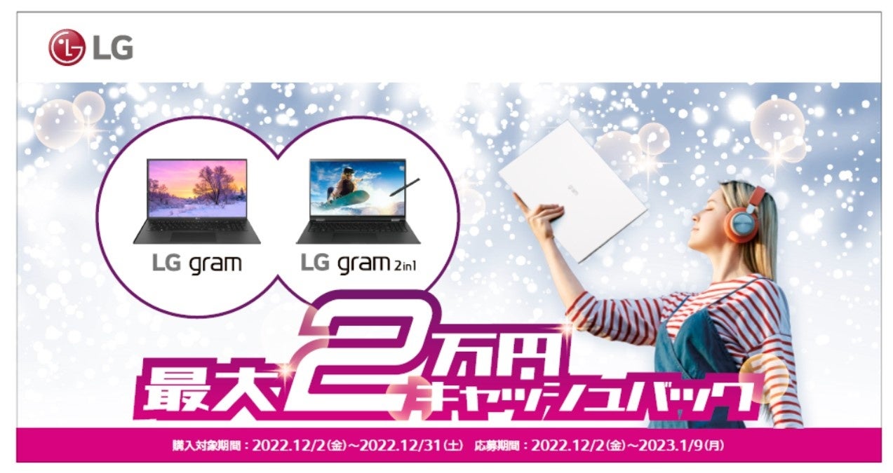 LGエレクトロニクス・ジャパン株式会社(代表取締役:孫 成周(ソン・ソンジュウ)本社:東京都中央区)は、本日2022年12月2日(金)より、モバイルノートパソコン「LG gram」を対象とした『LG gram 冬のキャッシュバックキャンペーン』を実施します。