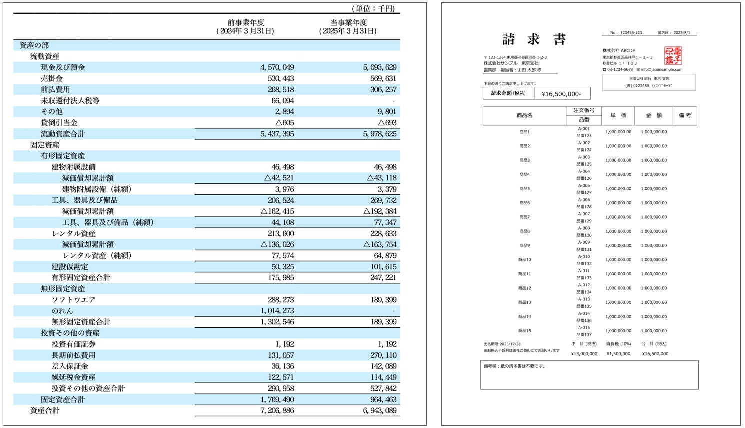 たとえば、長大な表を含む有価証券報告書、階層が分かれている財務諸表、複雑な形式の請求書・見積書をはじめ、罫線がなく明細項目が複数行にまたがる診療明細書、残高証明書・証券口座一覧表など、複数表が混在するマルチテーブル帳票にも対応しています。