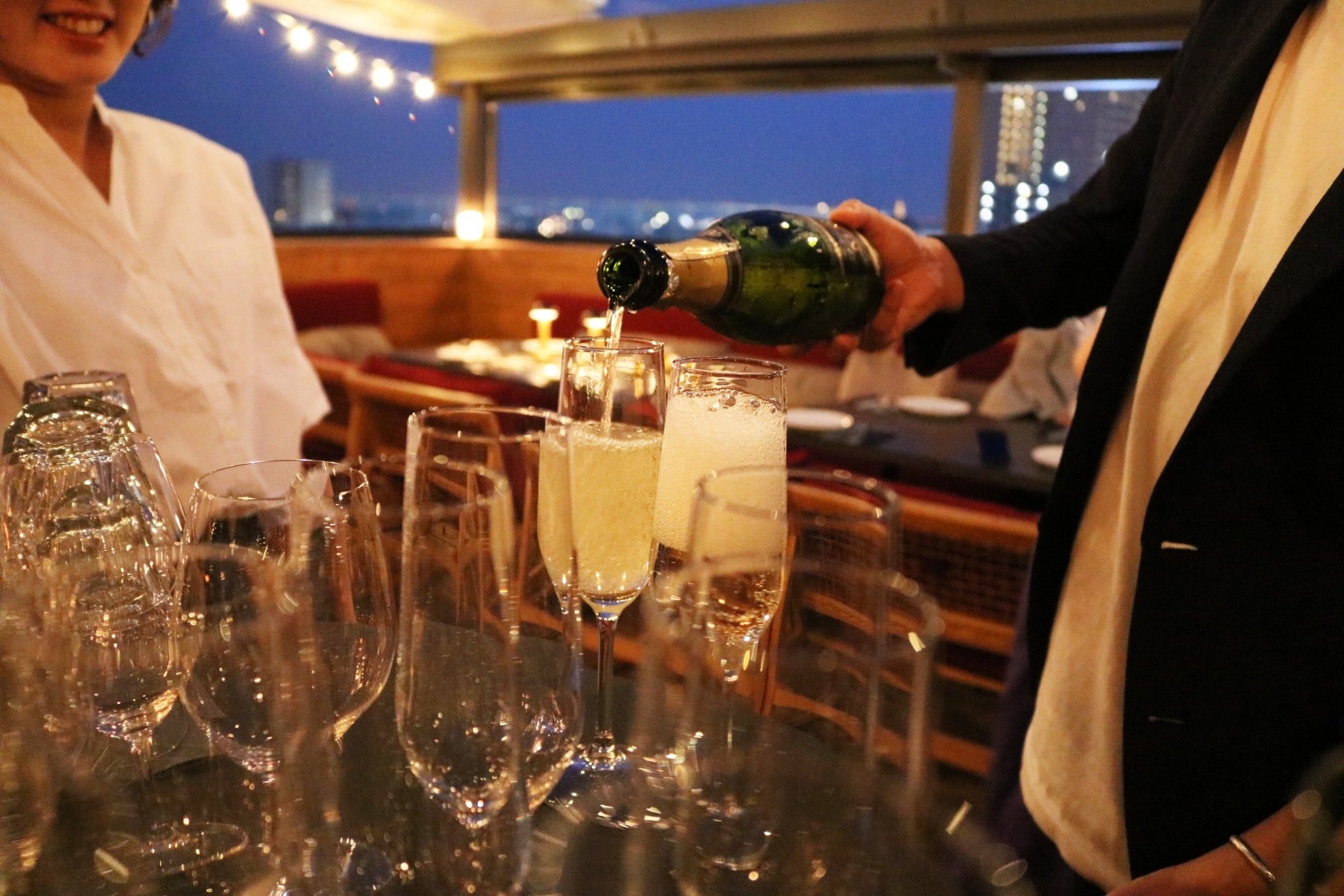 期間限定のビアガーデンコースは、兵庫県播磨灘産のプレミアムフレッシュオイスターなどの魚介が盛りだくさんのオーシャンプラッターを前菜にスパークリングワインで乾杯。