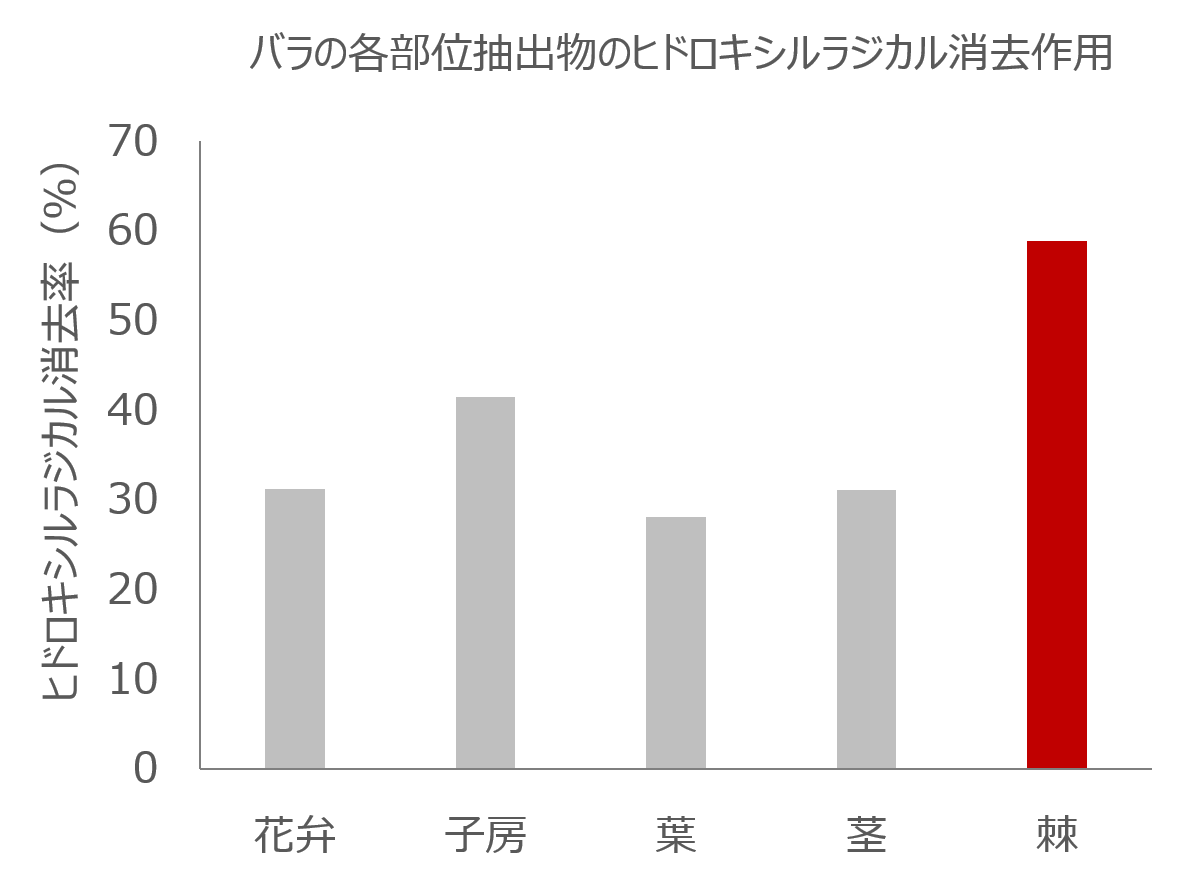 本来は、その美しさを人に見せることや、芳しい香りで人の気持ちを豊かにすることが一般的なバラの役割です。当社のバラ園で栽培しているバラは、その美しい姿を見せることなく、バラの成分や、ローズウォータ―として、化粧品に生まれ変わります。これまでは、主にバラの花弁から成分を抽出してきましたが、花弁以外の従来、廃棄してきた部位を有効活用できないかと研究を進めました。花弁・子房・葉・茎・棘を調べた結果、棘に最もヒドロキシルラジカルなどの活性酸素を消去する能力があることがわかりました。今回バラ園のバラの中でも最も棘の多い茎をもつバラから、オリジナル成分を抽出し、今後の化粧品開発に搭載していく予定です。