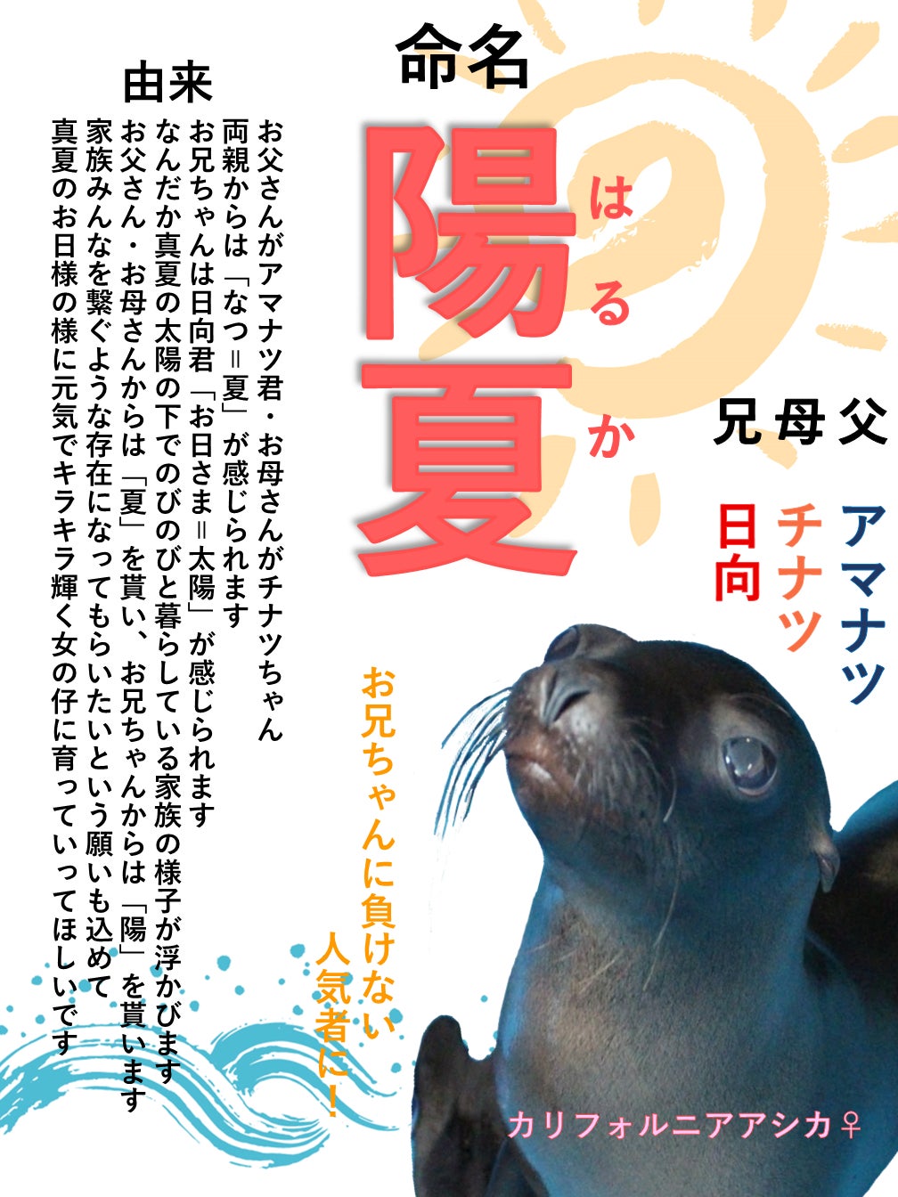 今回、全414件の候補の中から選ばれたカリフォルニアアシカのお名前は「陽夏(はるか)」です!!