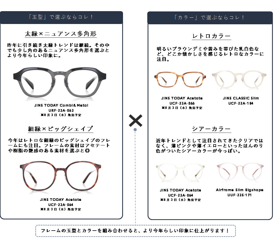 23年秋冬の新作モデルは、今季ファッションキーワードとして注目されている「プレッピー」や「カレッジ×スポーツ」との着こなしを提案。商品は、「JINS TODAY Acetate(以下Acetate)」と「JINS TODAY Combi&Metal(以下Combi&Metal)」の全4型12種を展開。1990~2000年代を彷彿とさせる個性溢れる玉型やカラーリングのメガネを中心にラインアップします。