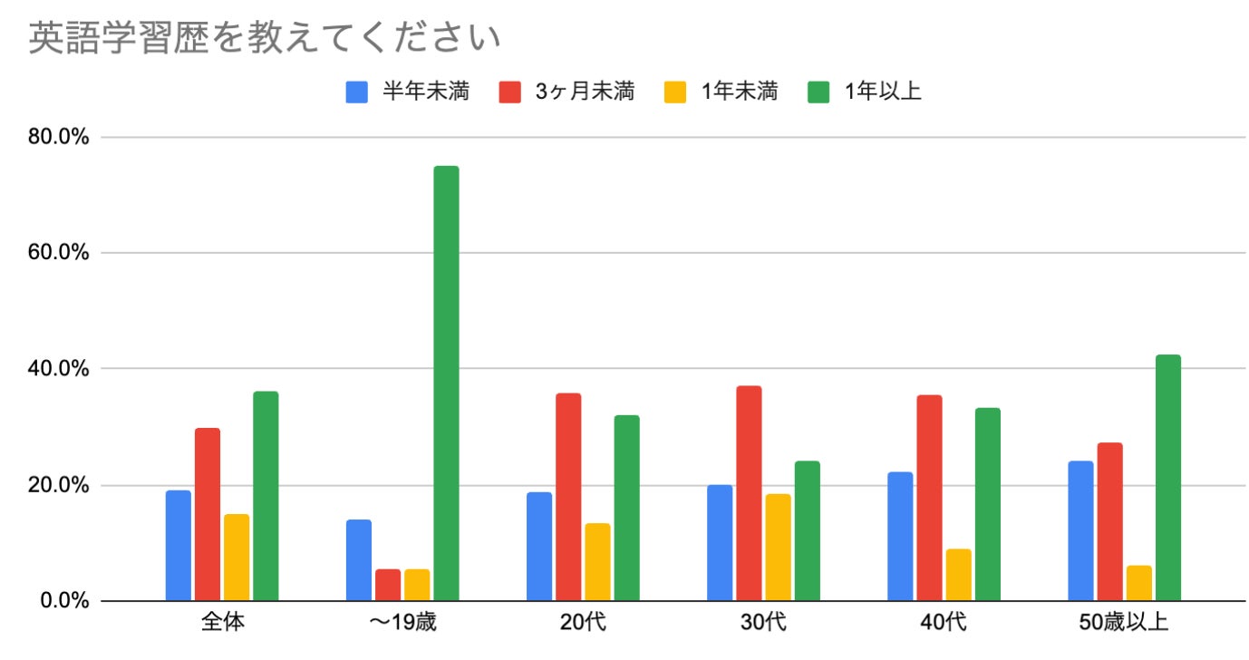 英語の学習期間は全世代で1年以上がもっとも多く、ついで3ヶ月未満となりました。Z世代を含む20代、30代の若手層では3ヶ月未満が最も多く、始めたばかりの学習者が多い傾向が見受けられました。
