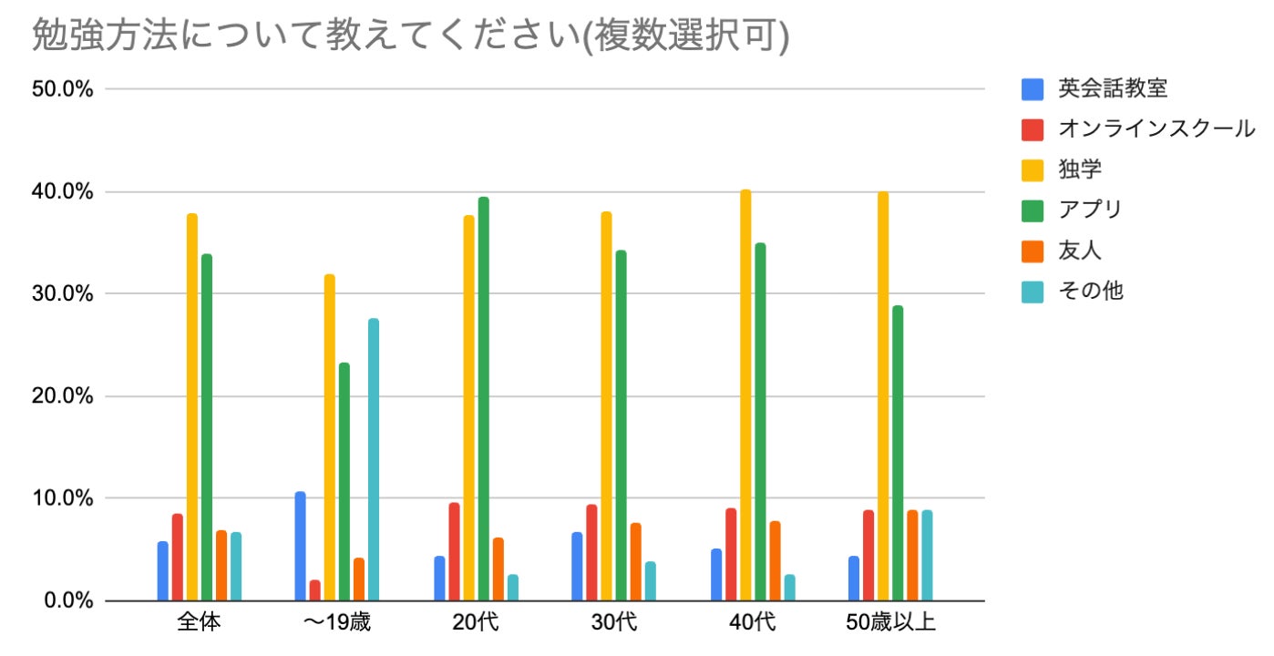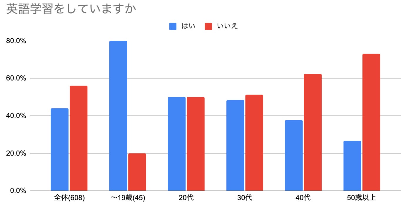 英語学習率は10代で80%と最も高く、20代、30代では約50%となりました。若手世代では半数以上が英語学習をしている一方で、40代以降は非学習者が学習者を超えており、世代間の学習率に差があることがわかりました。
