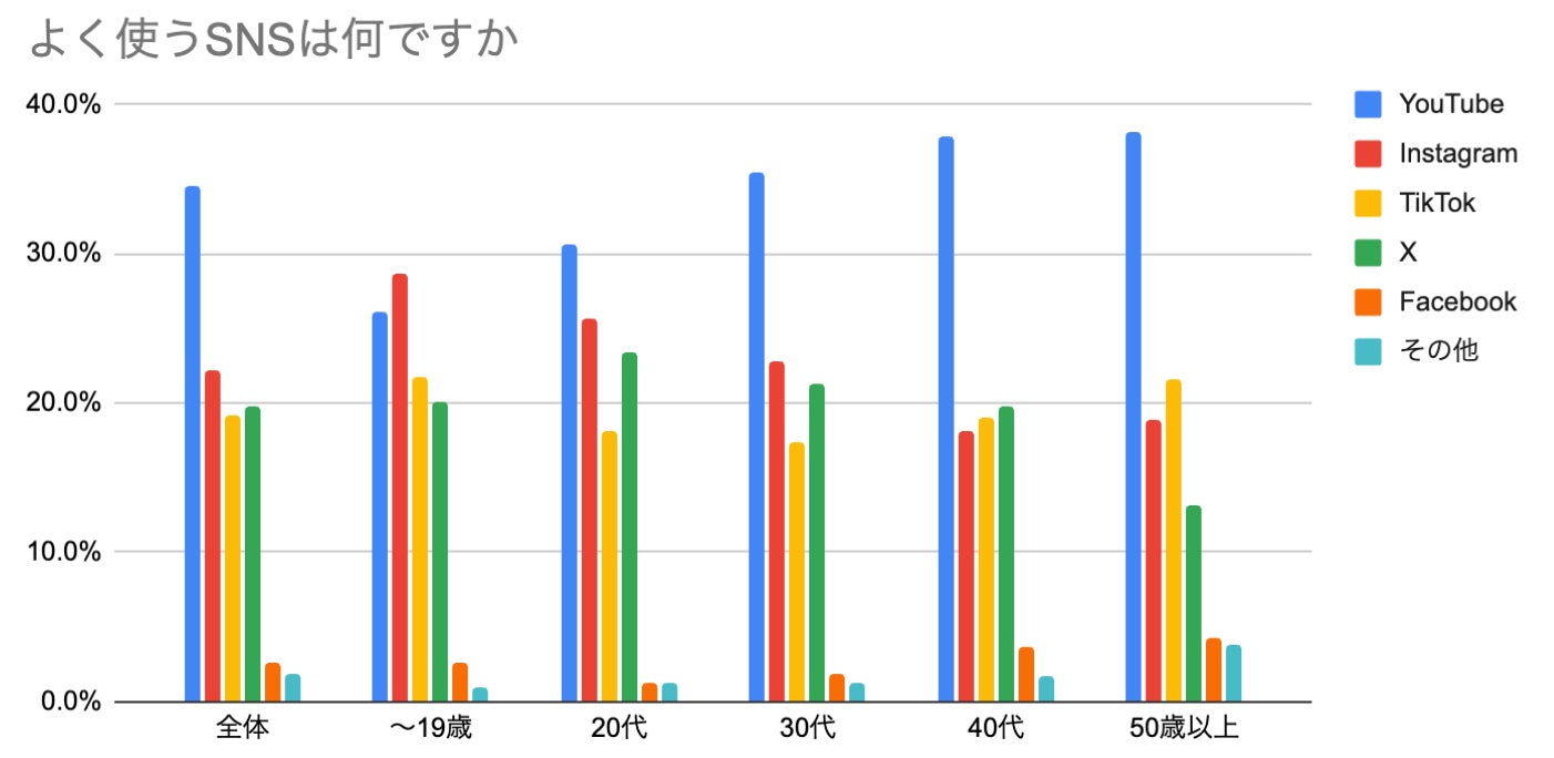 今回の調査ではよく見るSNSとして全世代でYouTubeがもっとも使われており、次いでInstagramが利用されています。10代ではInstagramが最も利用されている結果となりました。