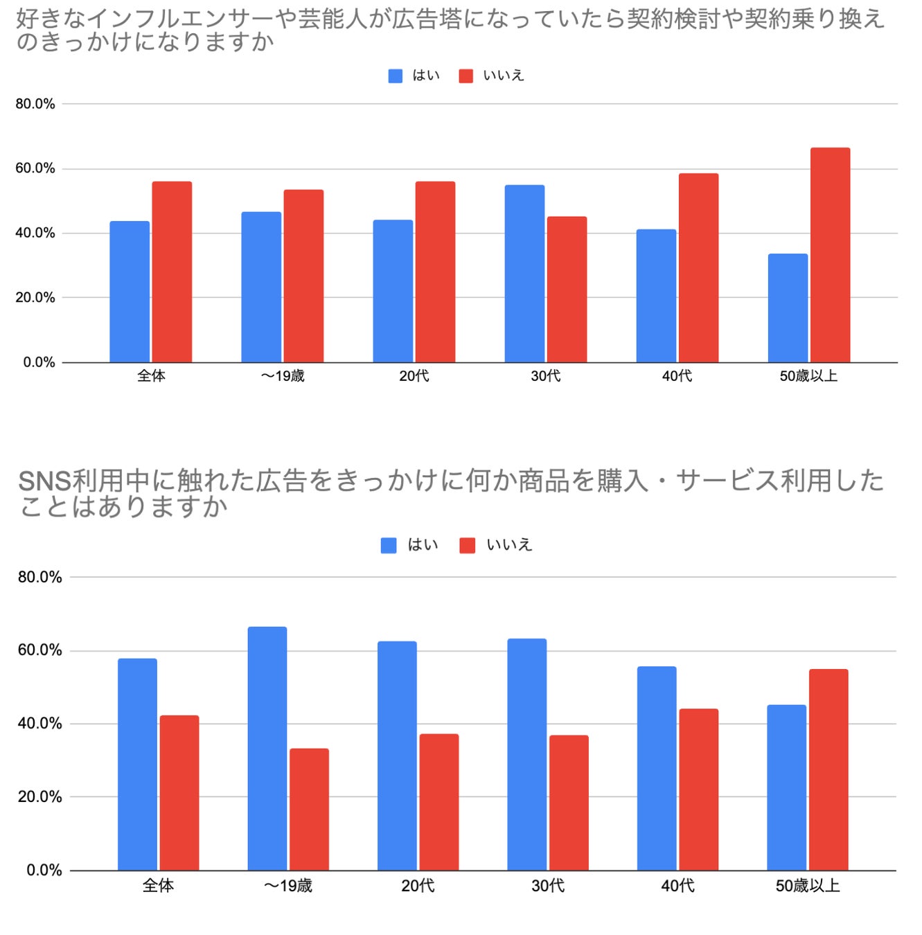 SNS上の広告コンテンツをきっかけにした商品やサービスの購入経験は50代以上を除く全世代で「はい」が「いいえ」を上回り、さらに好きなインフルエンサーや芸能人が出演する広告への好意は30代で最も高くなりました。