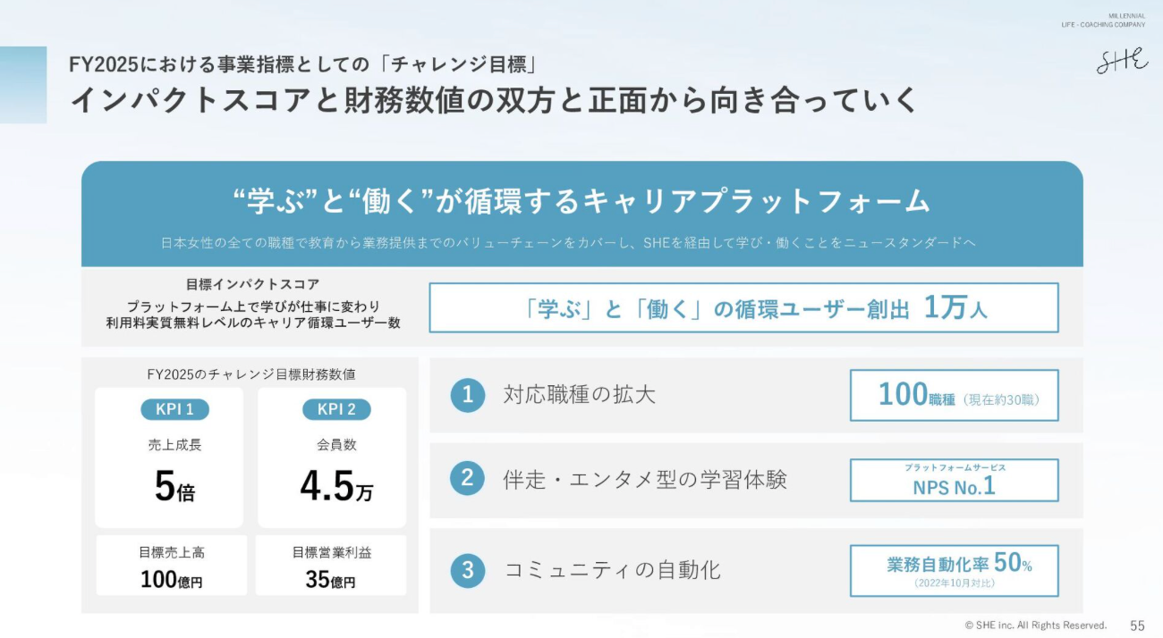 SHEとして「学ぶ」と「働く」が循環するプラットフォームを構築することで、意志ある人は誰も取り残さずにリスキリングでき、理想のキャリア・生き方を叶えられる仕組みを提供していく所存です。