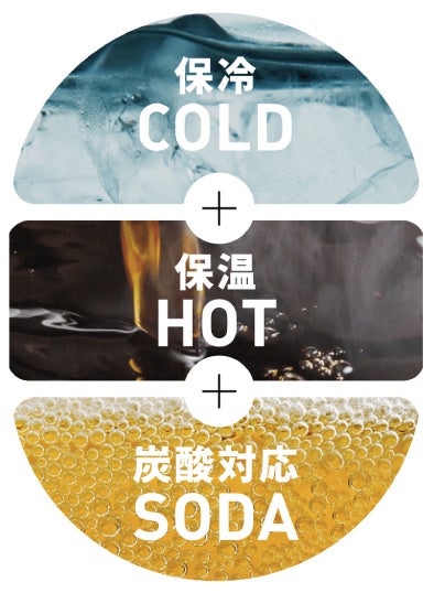 従来の真空断熱炭酸ボトルから、飲み口の形状を変更することで、温かいドリンクも対応可能になりました。暑い夏は冷たいドリンクやビール、ハイボール※を、寒い冬は温かいドリンクが楽しめ、年中活躍する真空断熱炭酸ボトルです。