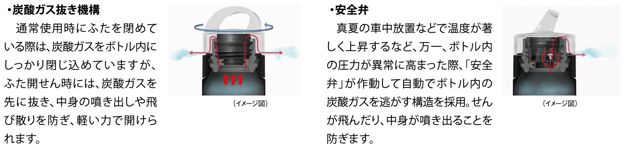 ※内容物の量が少ない場合や内容物の温度が高い場合など、ご使用状況により炭酸が抜けやすくなることがあります。