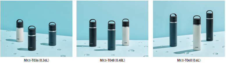 また、MTA-T型(0.5L/0.8L/1.2L/1.5L)は、スポーツ観戦やアウトドアシーンで活躍する大容量中心のサイズ展開ですが、MKB-T型は、日常生活で使いやすい0.36L/0.48L/0.6Lの3サイズをご用意。オフィスや学校、ちょっとしたお出かけ時に手軽に持ち運んでいただくことができます。