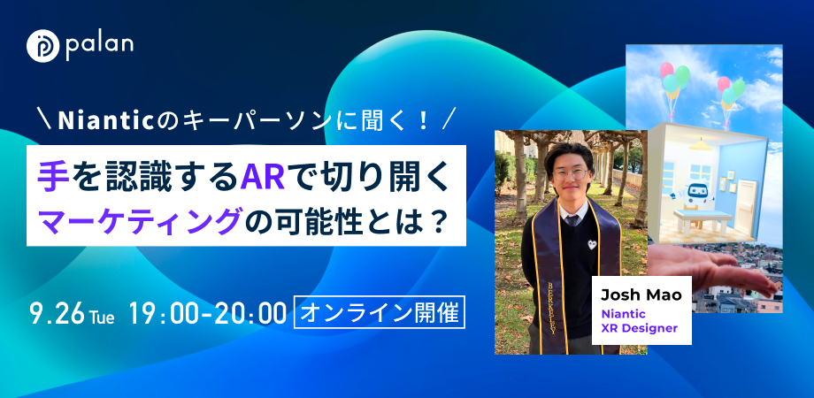 本セミナーでは、ハンドトラッキングを中心に広がるAR試着や、手を使った体験についてNiantic社 XR designer Josh Mao様をゲストスピーカーにお招きし、ハンドトラッキングの現状や事例についてご紹介いただきます。さらにノーコードでARを作成できるサービス「palanAR」におけるハンドトラッキング事例やAR体験についてもご紹介します。