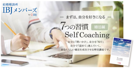 このたびIBJと提供を開始する『7つの習慣セルフコーチング 婚活編~まずは自分を好きになる~』は、セルフコーチング(自己対話)を通して会員様自身の結婚に対する価値観を明確にし、主体的な選択をサポートしていく内容になっています。