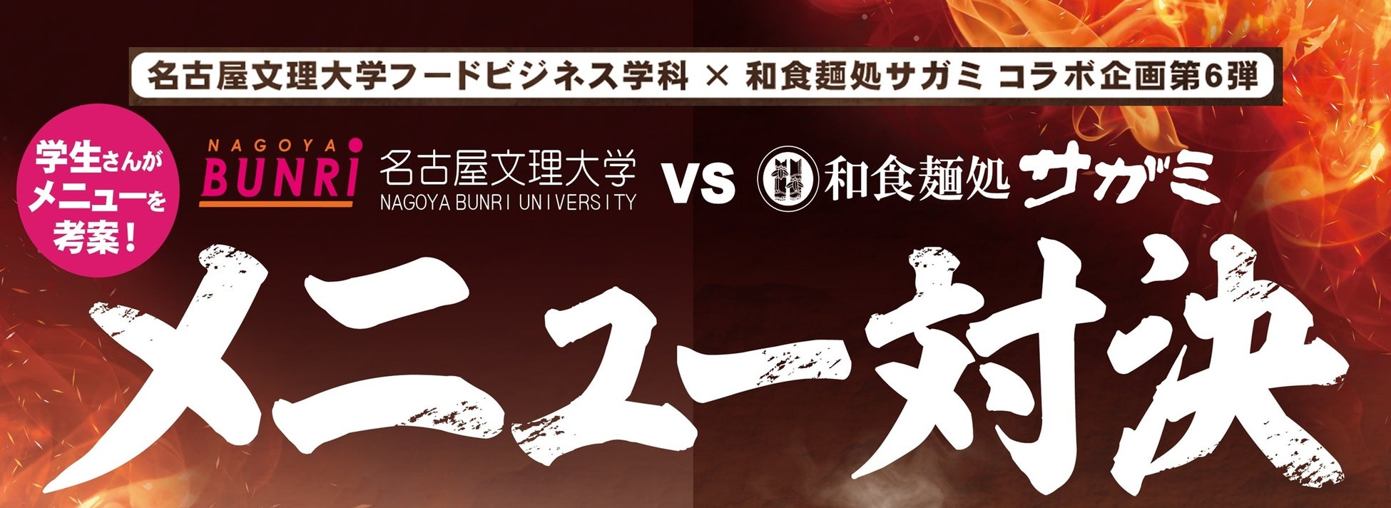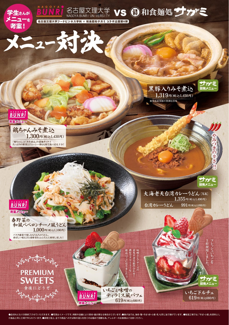またメニューは対決形式になっており、名古屋文理大学と和食麺処サガミのそれぞれの商品の魅力が光るようにいたしました。サガミ稲沢店の限定メニューとなりますので、この機会に是非ご賞味ください。