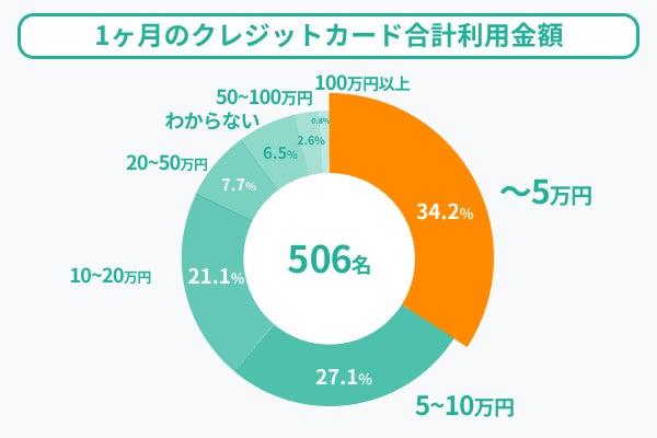 クレジットカードでの1ヵ月の合計利用金額は、1位が「~5万円」で34.2%、2位が「5~10万円」で27.1%、3位が「10~20万円」で21.1%となりました。5万円未満が最も多く、無理のない範囲でクレジットカードを利用していることが伺えます。また、商品購入代金だけでなく、光熱費や通信費などにもクレジットカードを利用する場合、2位と3位の「5~20万円」にボリュームが集まることも納得できます。