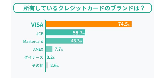 所有しているクレジットカードのブランドでは、1位が「VISA」で74.5%、2位が「JCB」で58.7%、3位が「Mastercard」で43.3%という結果になりました。調査対象者のうちの7割超が「VISA」を選択しており、特に利用者数の多い国際ブランドであることがわかります。