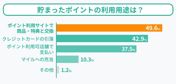 貯まったポイントの利用用途は、1位が「ポイント利用サイトにて、商品や特典と交換」で49.6%、2位が「クレジットカードの引き落とし」で42.9%、3位が「ポイント利用できるコンビニ/スーパー/ショッピングモールで支払い」で37.5%となりました。