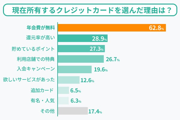 所有しているクレジットカードを選んだ理由では、1位が「年会費が無料だったから」で62.8%と最も多い回答となりました。次いで「還元率が高かったから」が28.9%、「普段貯めているポイントのカードだから」が27.3%、「よく利用する店舗での特典が良かったから」が26.7%となりました。コストパフォーマンスの良さやお得な買い物を求める人が多いことがわかります。