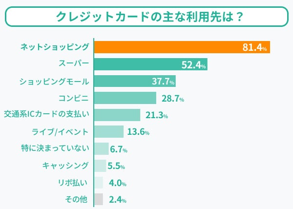 主なクレジットカードの利用先では、1位が「ネットショッピング」で81.4%、2位が「スーパー」で52.4%、3位が「ショッピングモール」で37.7%となりました。