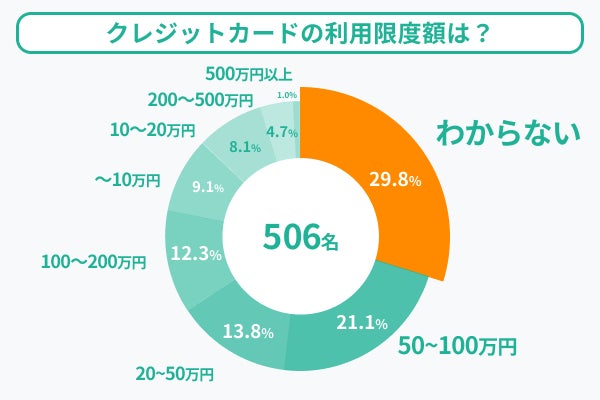 利用限度額についての回答では、1位が「わからない」で29.8%、2位が「50~100万円」で21.1%、3位が「20~50万円」で13.8%となりました。多くの人がクレジットカードの利用限度額について把握していないことが判明しました。