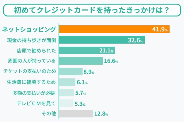 初めてクレジットを持ったきっかけは、1位が「ネットショッピングに利用したかった」で41.9%、2位が「現金を持ち歩くのが面倒(キャッシュレス)」で32.6%、3位が「店頭で勧められたから」で21.1%という結果になりました。