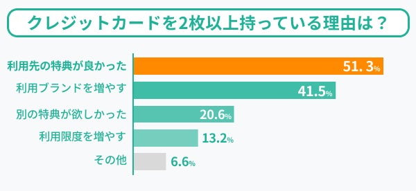 複数枚のクレジットカードを所有している方の理由は、1位が「利用先の特典が良いと思ったから」で51.3%、2位が「利用できるブランドを増やしたかったから」で41.5%、3位が「別の特典が欲しいと思ったから」で20.6%という結果になりました。