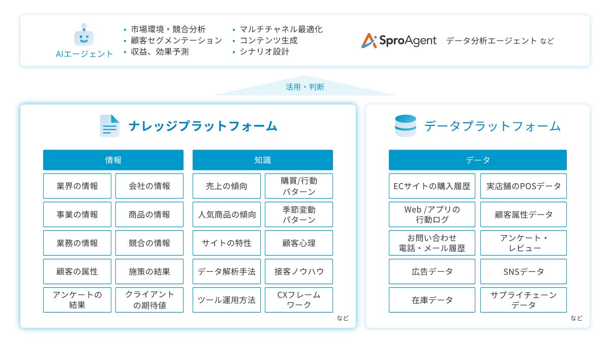 当社は、全プロダクトおよびサービスにAI技術を統合し、機能強化を実現します。この構想はすでに着実に進行しており、2025年7月にリリースしたSproAgentのデータ分析エージェントでは、ナレッジプラットフォームとの連携を開始しています。単なるデータの可視化にとどまらず、業界特性や顧客心理を踏まえた深い洞察を含むアウトプットの生成が可能となり、分析結果の質が大幅に向上しています。