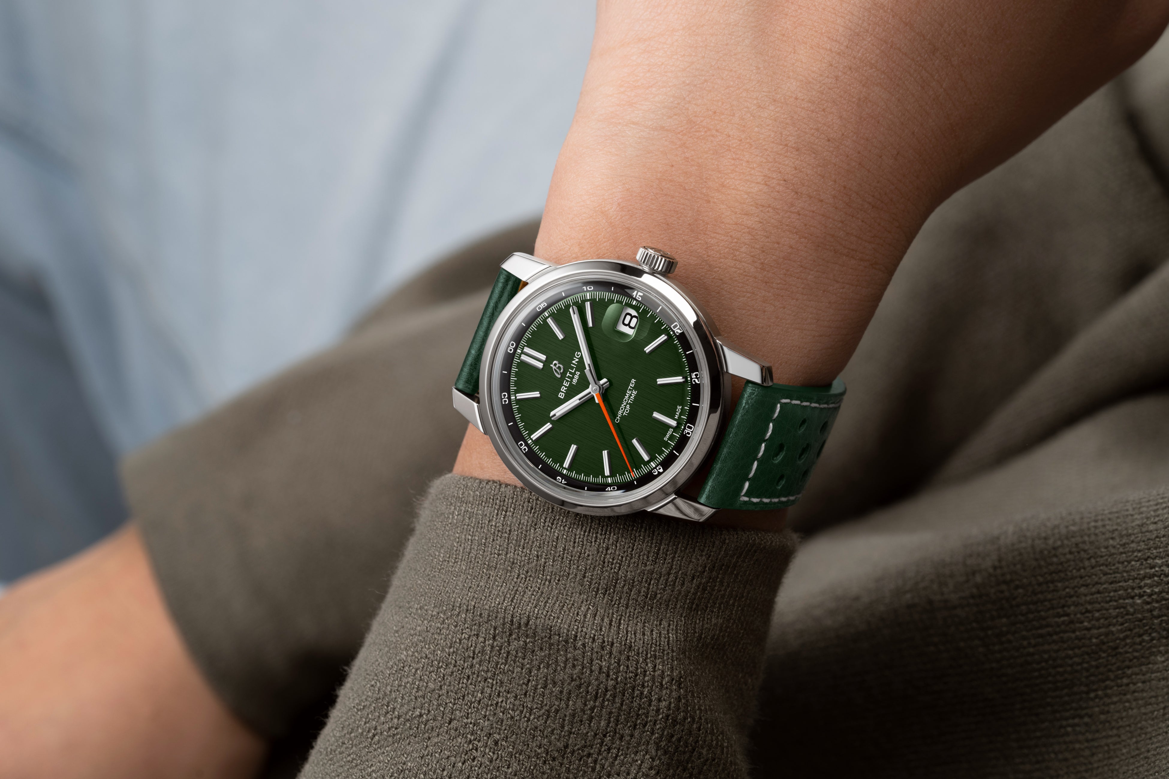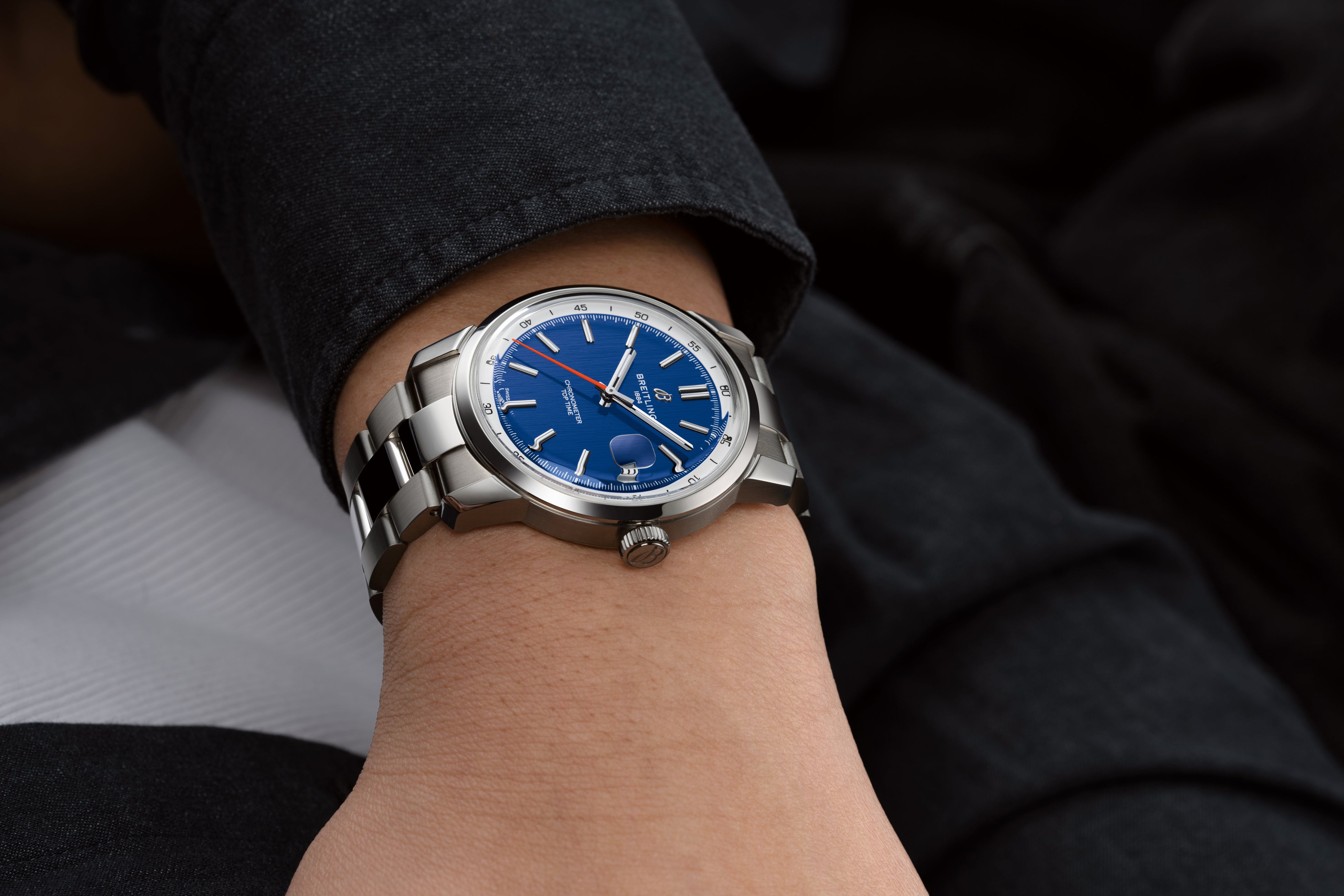 この時計には、コレクションのルーツであるレースにインスパイアされたコントラストステッチ入りのパンチングレザーストラップ、または非対称のセンターリンクを備えた3連ステンレススチールブレスレットのいずれかを組み合わせることができます。後者はブライトリングを象徴するデザインであり、手元の存在感を高め、よりスポーティな印象を与えます。