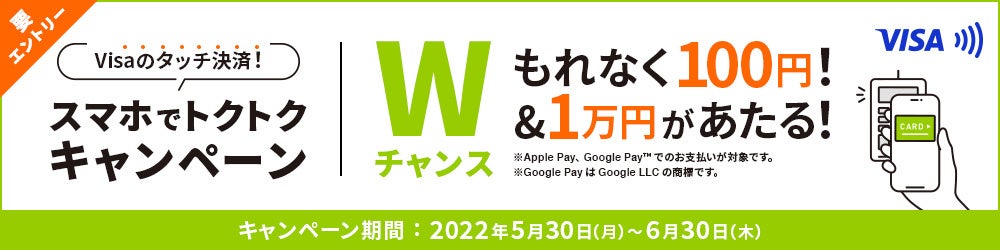 クレジットカードやスマートフォンをかざすだけで支払いできる「Visaのタッチ決済」。その手軽さを実感いただくべく、「Visaのタッチ決済!スマホでトクトクキャンペーン」を実施いたします。