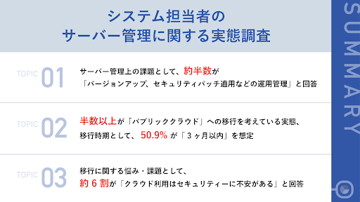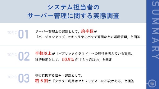 今回は、オンプレミスでサーバー管理を実施しているシステム担当者 109 名を対象に、システム担当者のサーバー管理に関する実態調査を実施しました。サーバー管理上の課題として、システム担当者の約半数が「バージョンアップ、セキュリティパッチ適用などの運用管理」と回答しました。また、半数以上が「パブリッククラウド」への移行を考えている実態が浮き彫りとなり、移行時期として、 50.9% が「 3 ヶ月以内」を想定しているようです。
