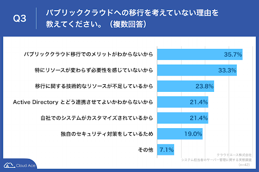 「パブリッククラウド移行でのメリットがわからないから」が 35.7% 、「特にリソースが変わらず必要性を感じていないから」が 33.3% 、「移行に関する技術的なリソースが不足しているから」が 23.8% という回答となりました。