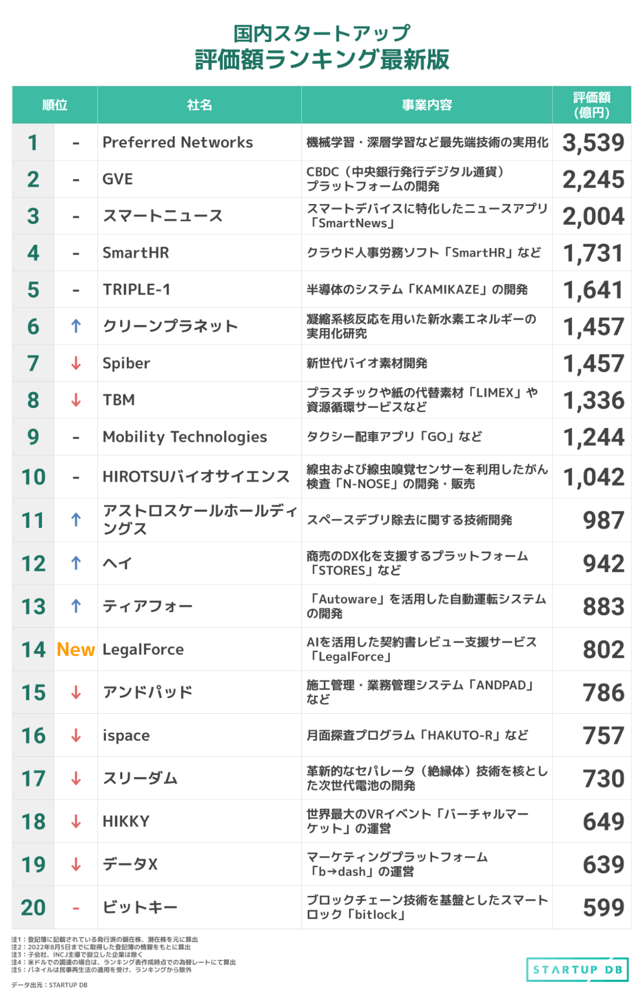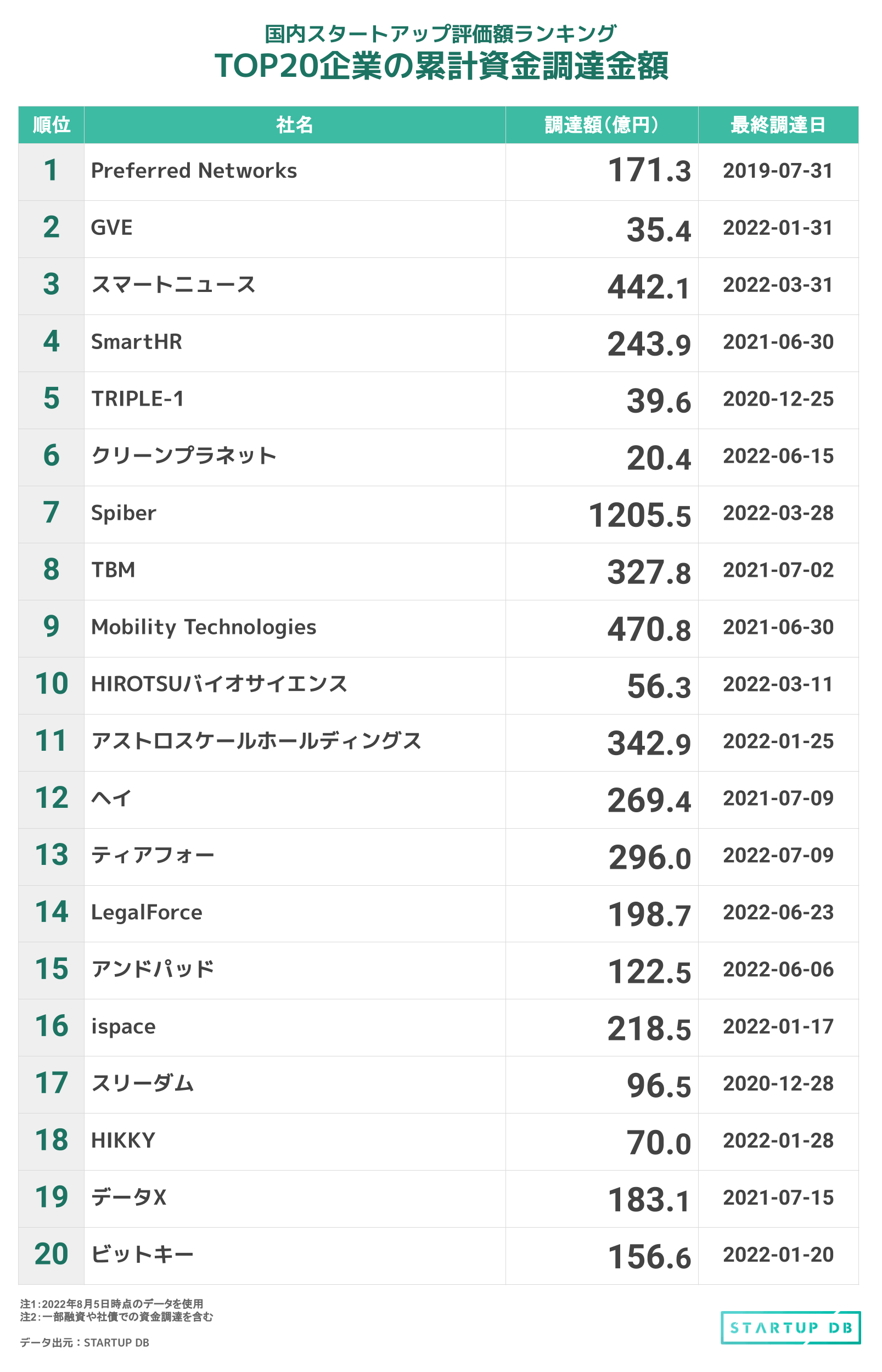【STARTUP DB】調査結果 国内スタートアップ評価額ランキング最新版(2022年8月)