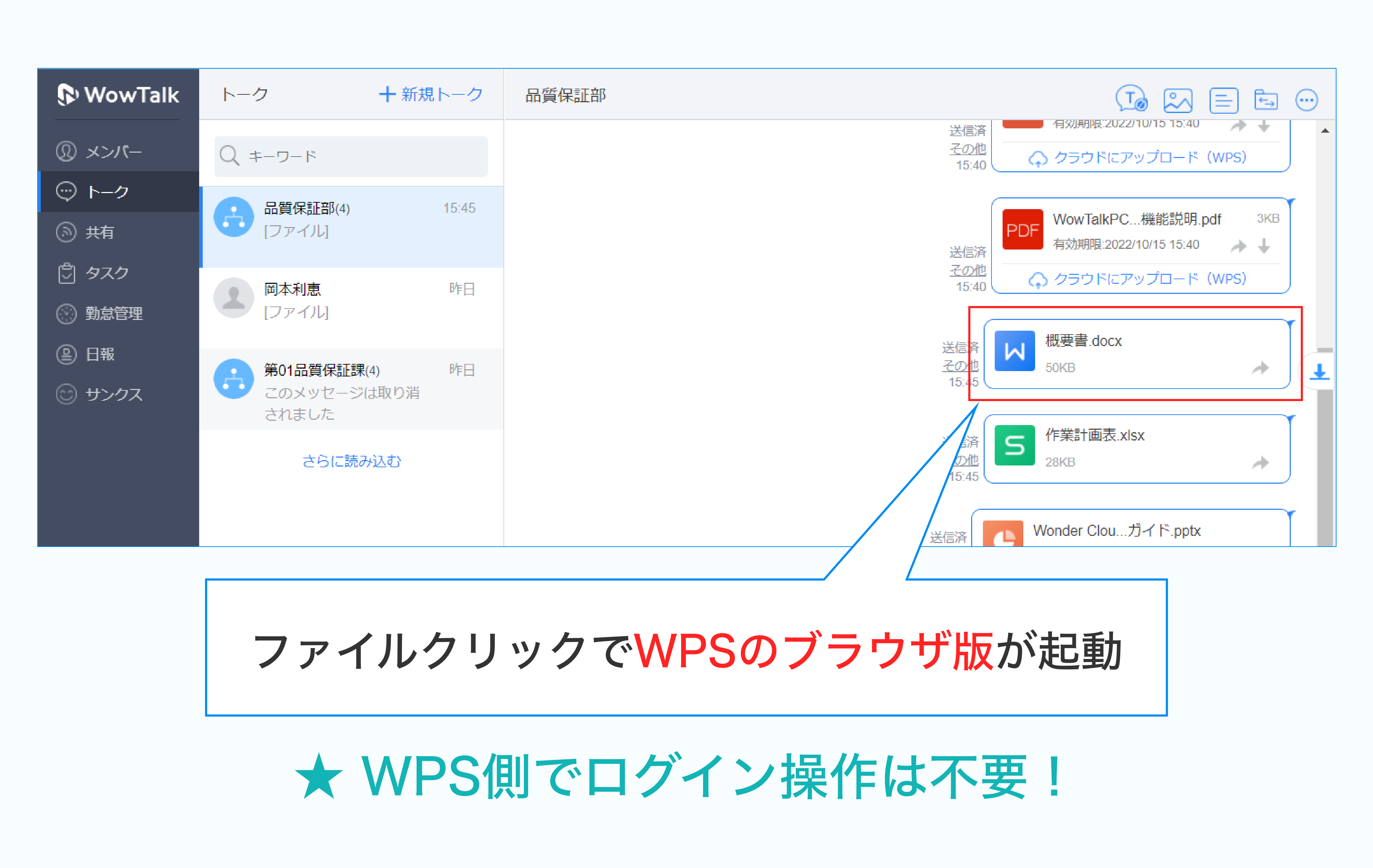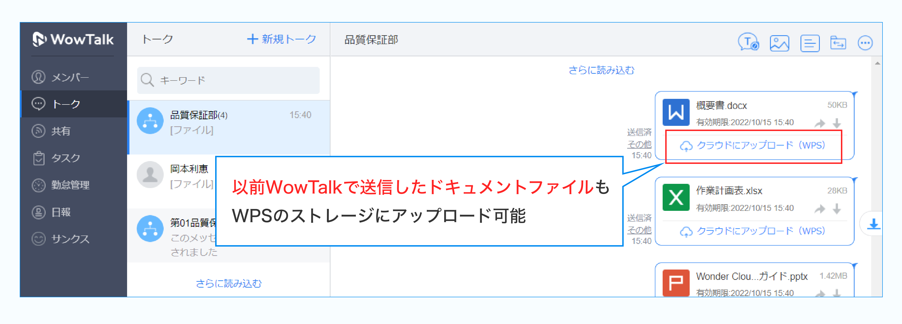 今回のアップデートによって、WPS Cloud Proのクラウドストレージ機能と、WowTalkのチャット機能がシームレスに繋がるようになり、ファイル共有やオンライン編集といった操作を、より簡便に行えるようになります。