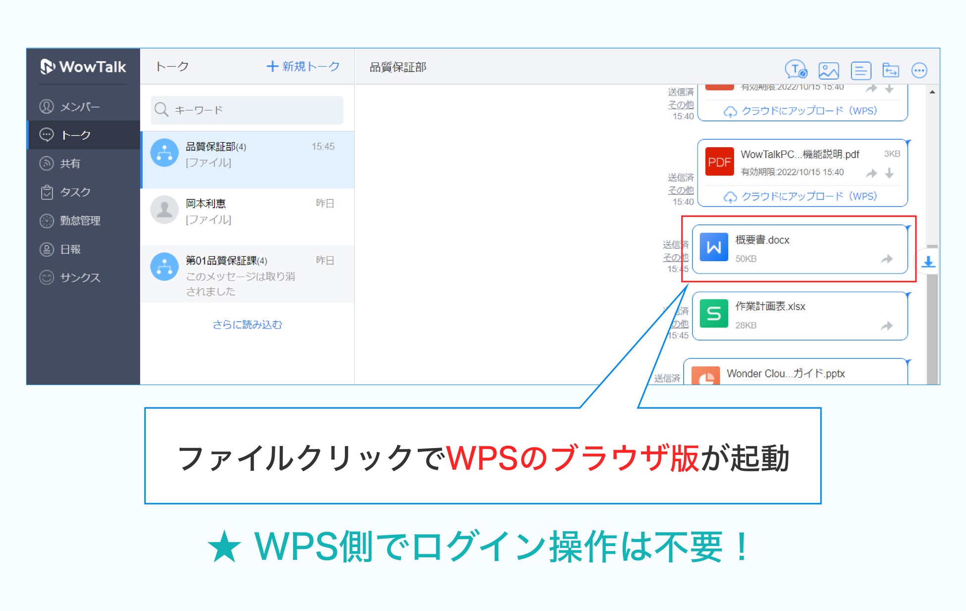 WPSのブラウザ版にアクセスするとき、WPSへのログイン操作を行う必要はありません。WowTalkのアカウントで、WPSに自動ログインされるためです。