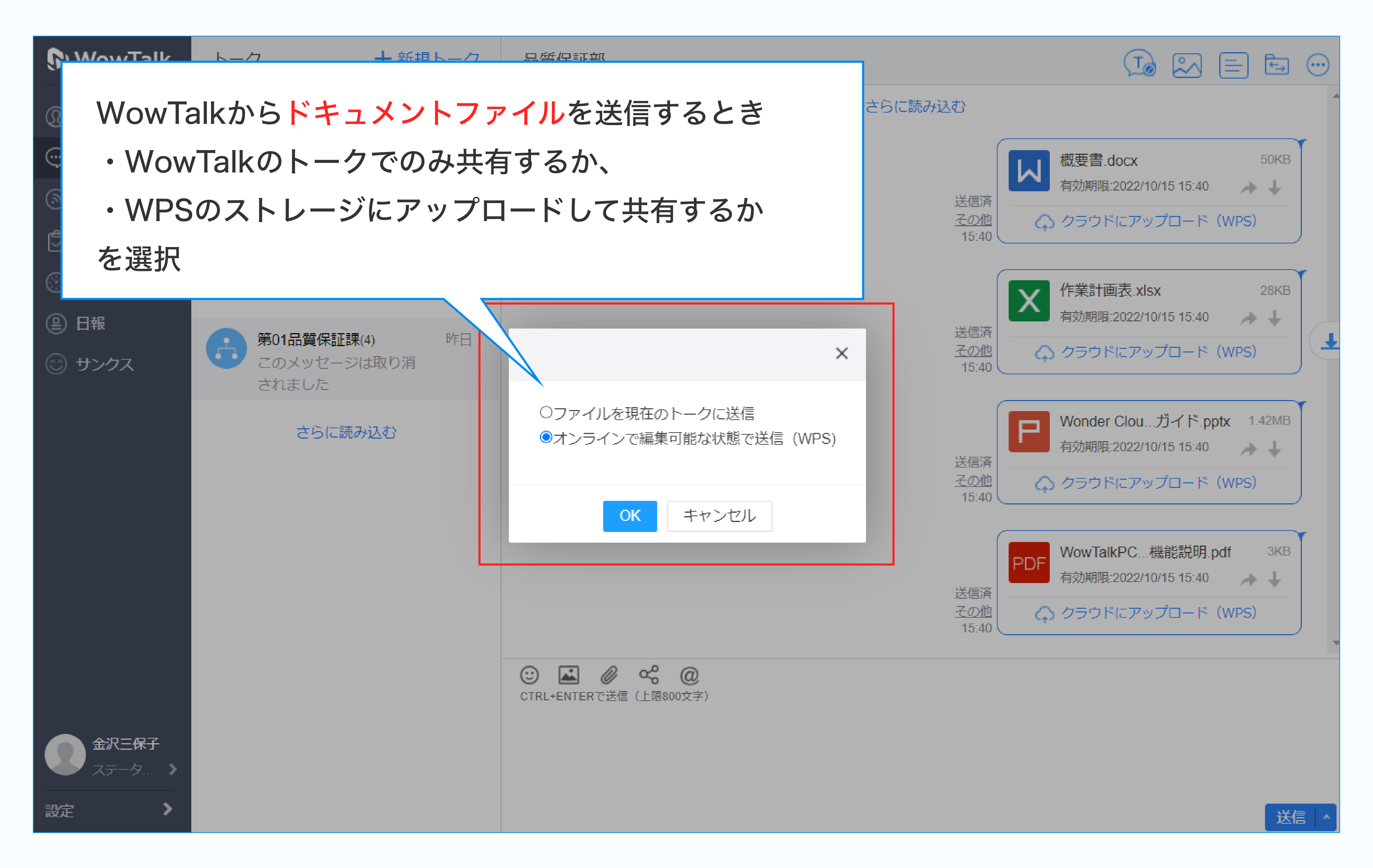 「ファイルを現在のトークに送信」を選択した場合、WPSストレージへのアップロードは行われず、WowTalk上のみでのファイル共有となります。オンライン編集を行わない、ストレージへ格納する必要がないといった場合は、こちらの選択が可能です。