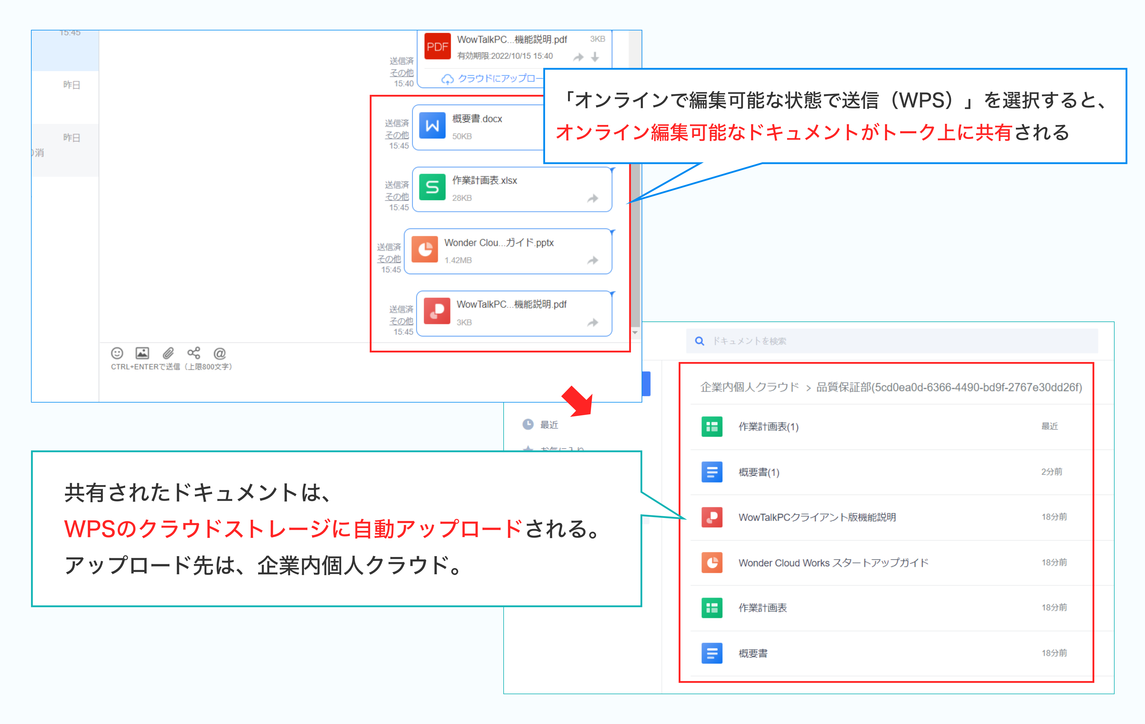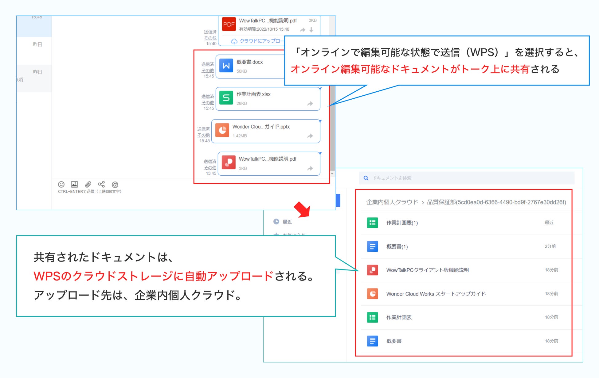 今回のアップデートにより、WowTalkとWPS Cloud Proのストレージ連携機能が強化され、チャット上で共有したドキュメントファイルの共同編集を、より簡便な操作で行っていただけるようになります。