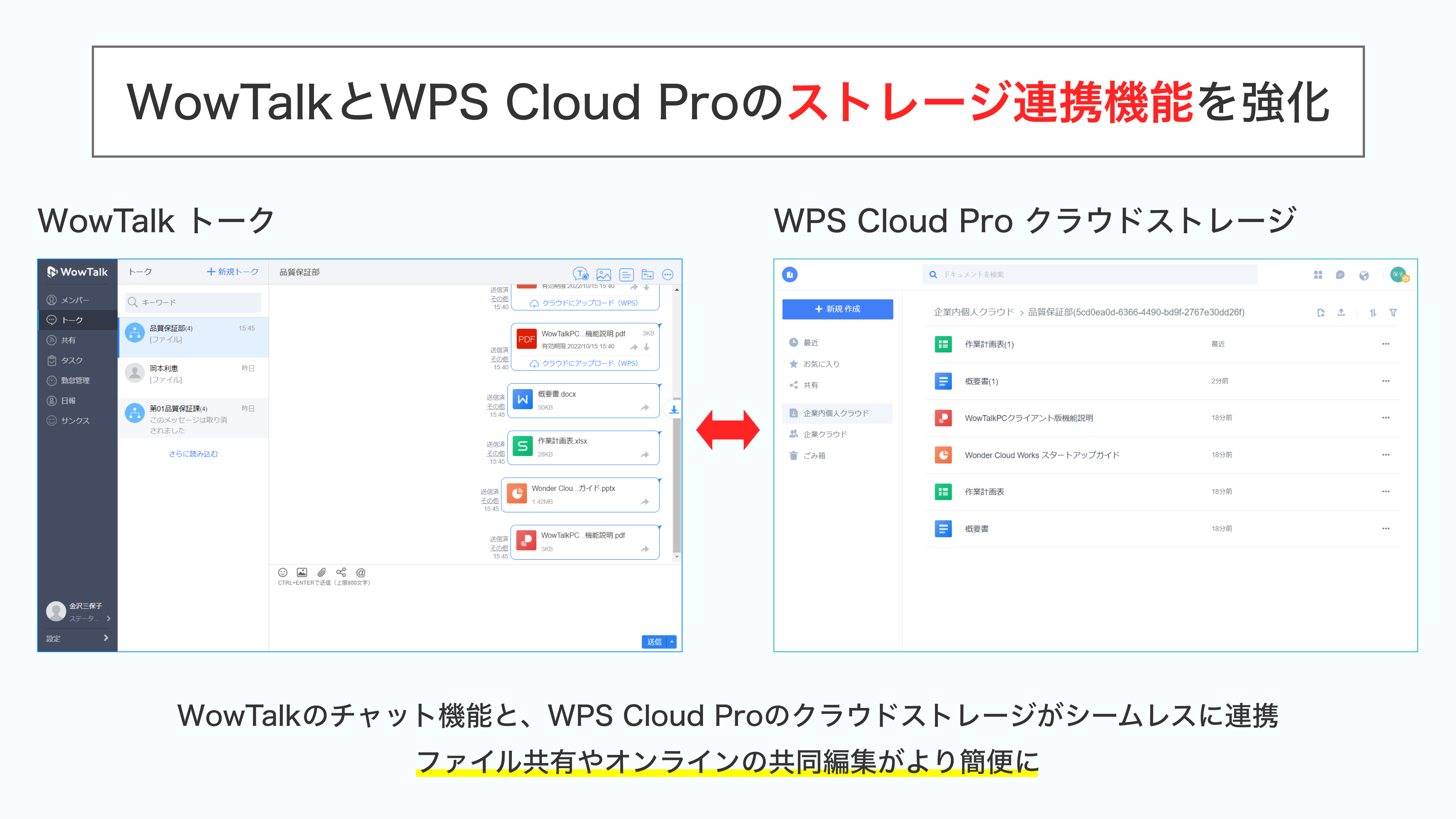 今回のアップデートでは、ビジネスチャット「WowTalk」と、クラウド型オフィス「WPS Cloud Pro」の機能連携における、「ストレージ連携」の機能強化を実施しました。