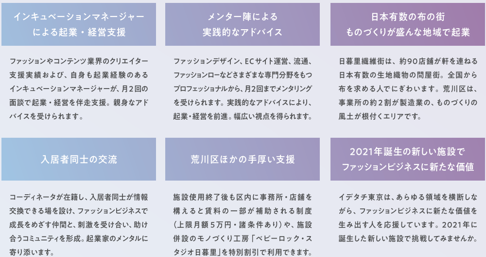 イデタチ東京は、ファッション関連産業で起業したい方をサポートする荒川区の起業支援拠点です。