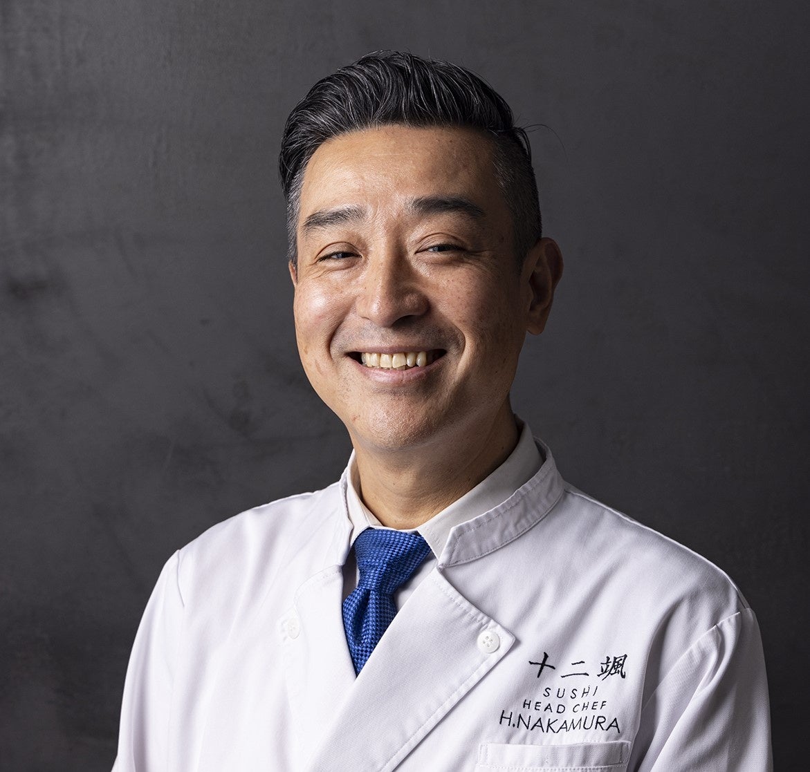 1993年 熊本県の老舗京料理、江戸前鮨店「亀八鮨」で修行を開始した中村は、魚の扱いやにぎり、接客などの基本を学び、1998年に開催された「すし技術コンテスト九州大会」において準優勝。その後2002年に三國清三氏プロデュースの「セントラルミクニ 三九二寿司」に入社、2004年には副料理長に昇格しました。大阪すし店舗の関東地区統括料理長を経て、2015年、ヒルトン東京 日本料理「十二颯」寿司料理長に就任しました。※2020年すし料理専門料理師免許を取得。